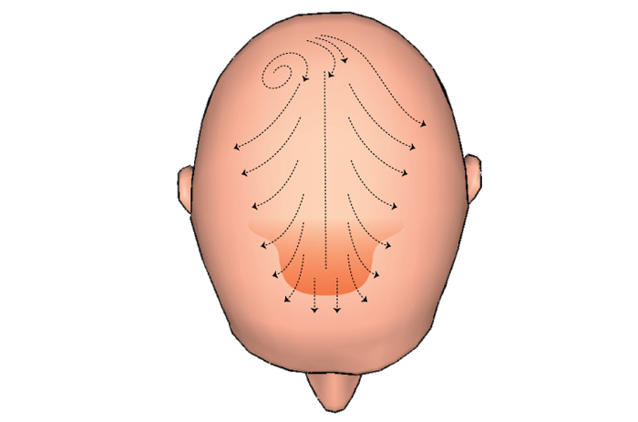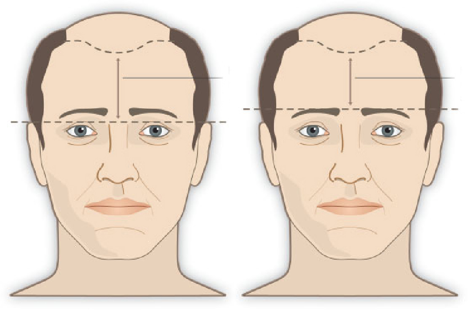 It is important to project the definitive frontal hairline, especially in young patients. The frontal hairline is projected in an irregular manner, maintaining the temporal recesses. A non-straight line is vital to have a more natural and non-detectable result. Usually, the forehead middle point is 8 cm distant from the root of the nose, varying from 7 to 9 cm depending on the facial structure.